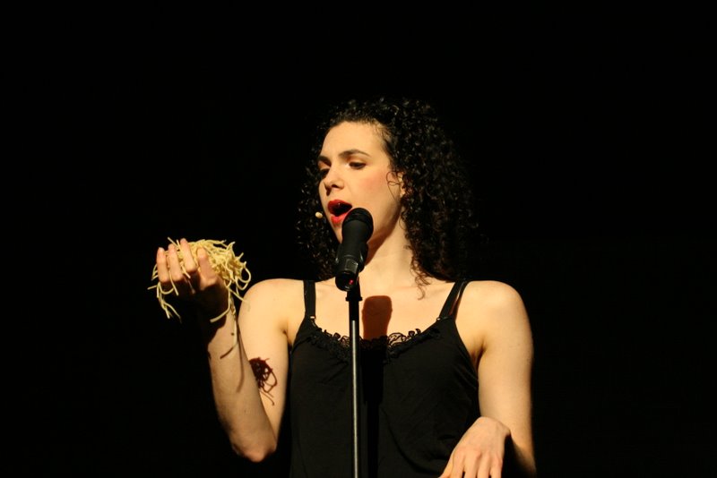Piccola Cosi, which in Italian means “small like this,” is based on Aja’s experience singing jazz in nightclubs and restaurants in Bologna, Italy. The show traces her development as a woman and a jazz singer, and is a sprawling cacophony of Italian culture and Aja’s own fractured understanding of it, where pizzas walk across tables and men appear as smoke in doorways.